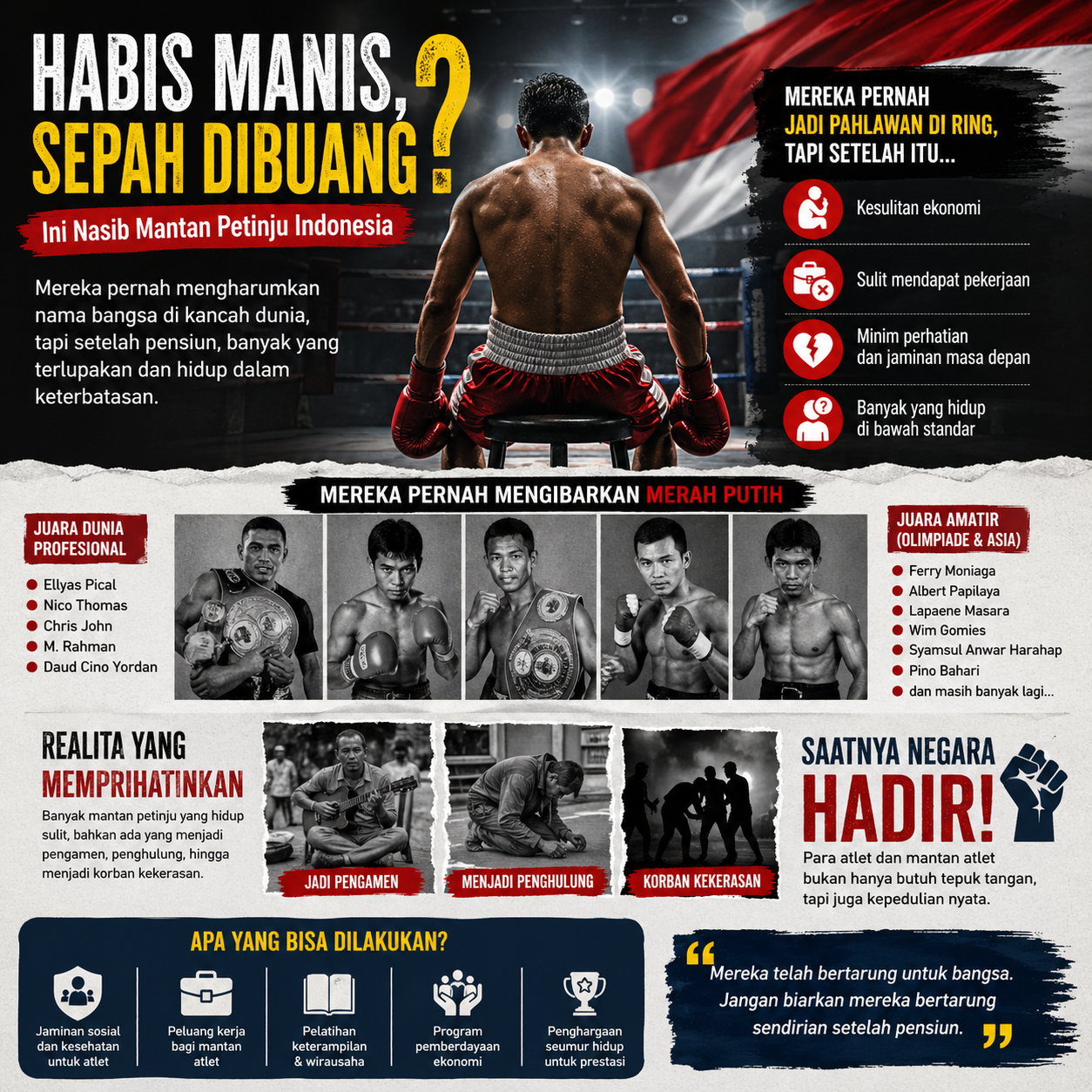 Setelah masa kejayaan berlalu, tidak sedikit mantan petinju justru menghadapi kenyataan pahit: kesulitan ekonomi, minimnya akses pekerjaan, hingga hilangnya perhatian dari sistem yang dahulu mengangkat mereka. Fenomena ini bukan cerita baru, tetapi terus berulang dari generasi ke generasi.